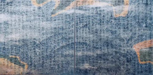 It is about the relationship between a person and the world. The extent of the painting representing the “world” surrounding the “person”- although composed of stiff rectangles- has been pushed and shuffled into a semi-organic arrangement, as though the presence of the human figure in the centre has disrupted the rectilinearity of the panels it is drawn upon. Tender grain of the wooden material is preserved and shows through the human figure, further contrasting wth the flat painted space surrounding the figure. The world in this work is imprisoning, heavy and emotionless, appears to be impenetrable at first glance.